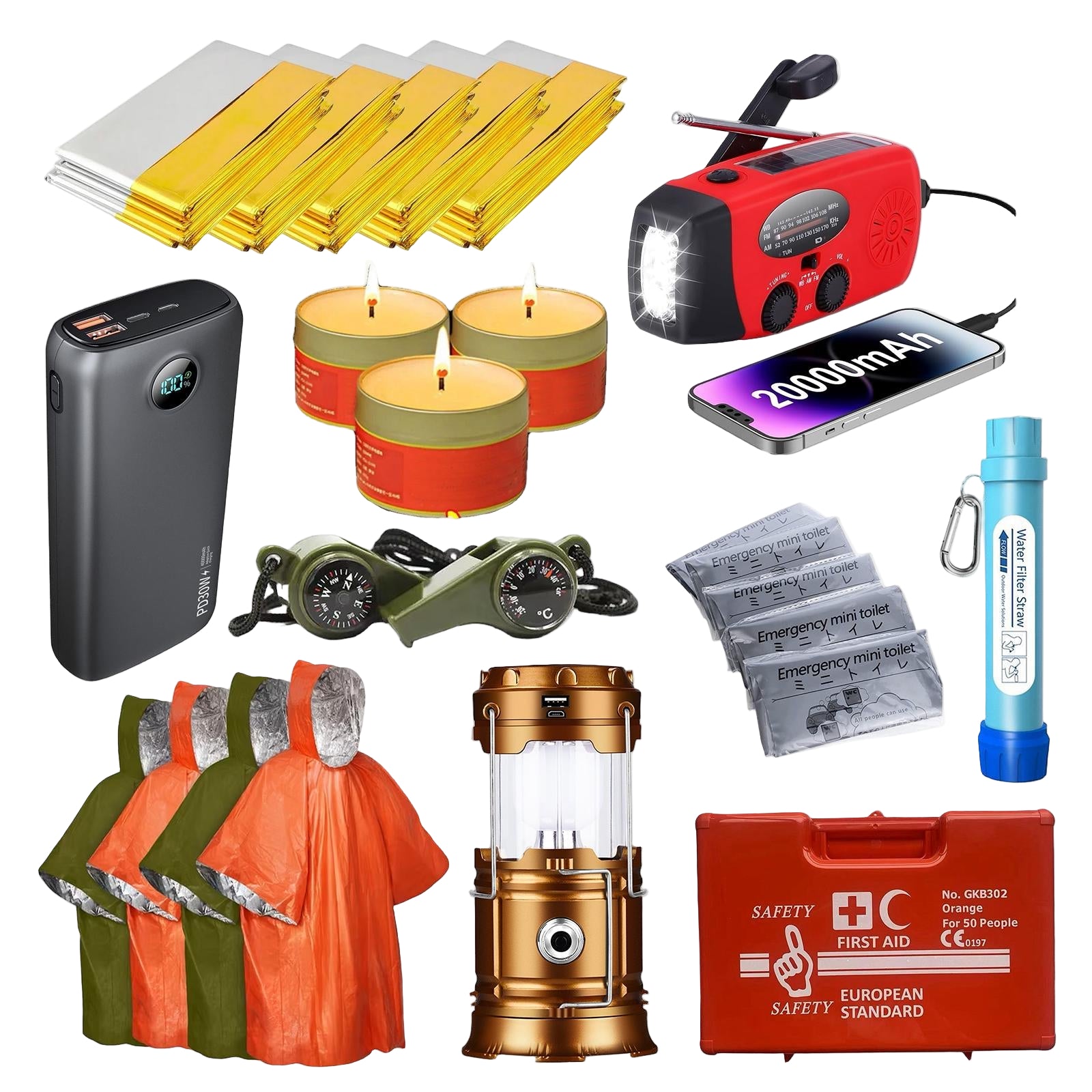 - Warmte en bescherming: thermische nooddekens en waterdichte poncho’s helpen je warm en droog te blijven.
